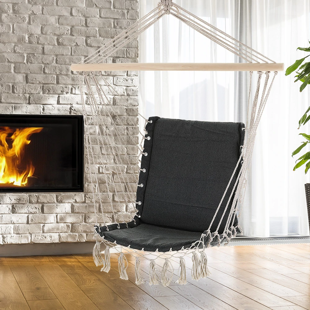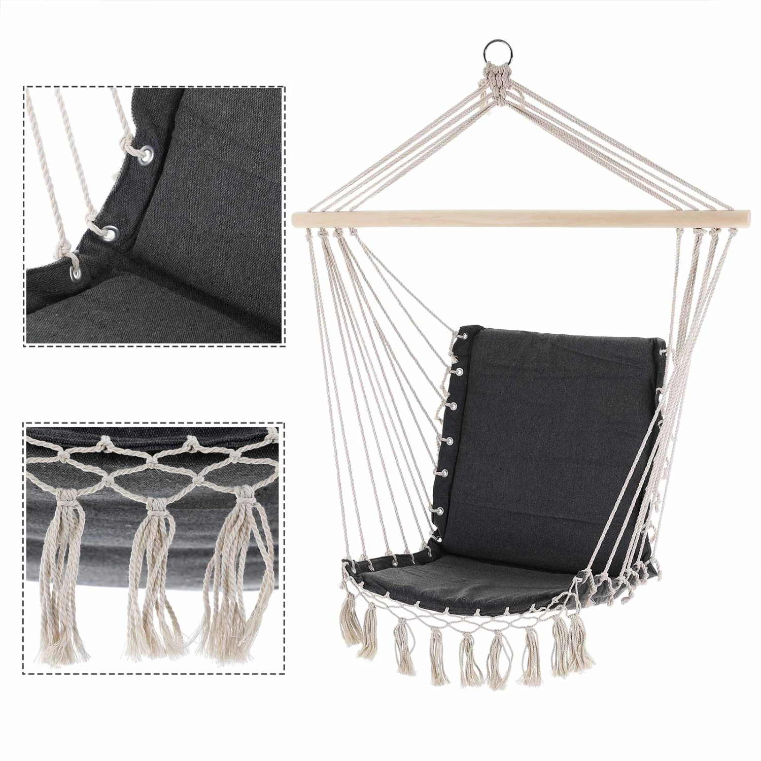 Das Sitzpolster sogt für mehr Bequemlichkeit, es besteht aus atmungsaktivem 320 g/m² Baumwoll-Polyester-Gemisch, der anschmiegsame Stoff passt sich der Form Ihres Körpers an, ist hautfreundlich, wetterfest und wasserabweisend. Der Hängesessel wird durch reißfeste Schnüre mit der stabilen Holzquerstange und dem robusten Stahlring verbunden.