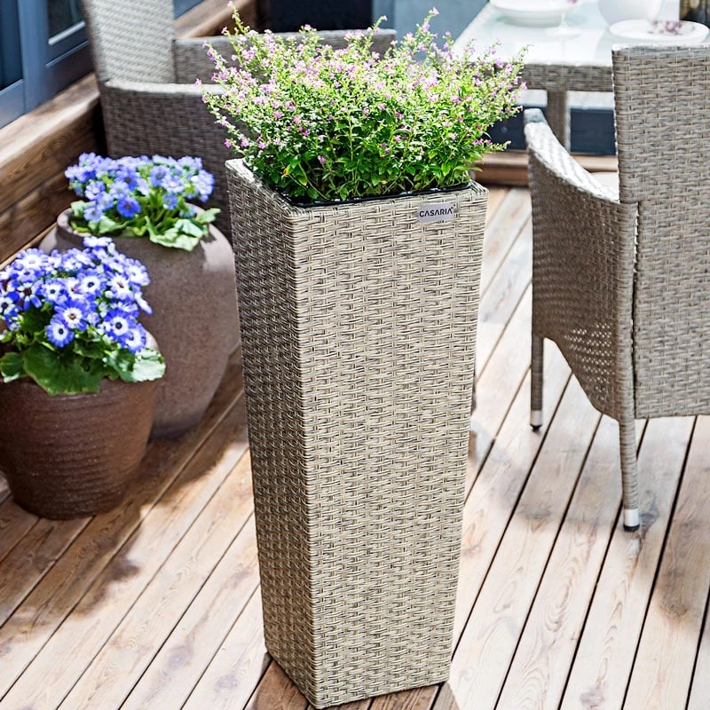 Polyrattan ist eine sehr stabile, gleichmäßig gewickelte Kunststofffaser, die extra für Gartenmöbel entwickelt wurde. Es ist wetterfest, UV-lichtbeständig, schmutzabweisend und einfach zu reinigen. Die Innentöpfe lassen sich problemlos aus dem Gestell herausnehmen.
