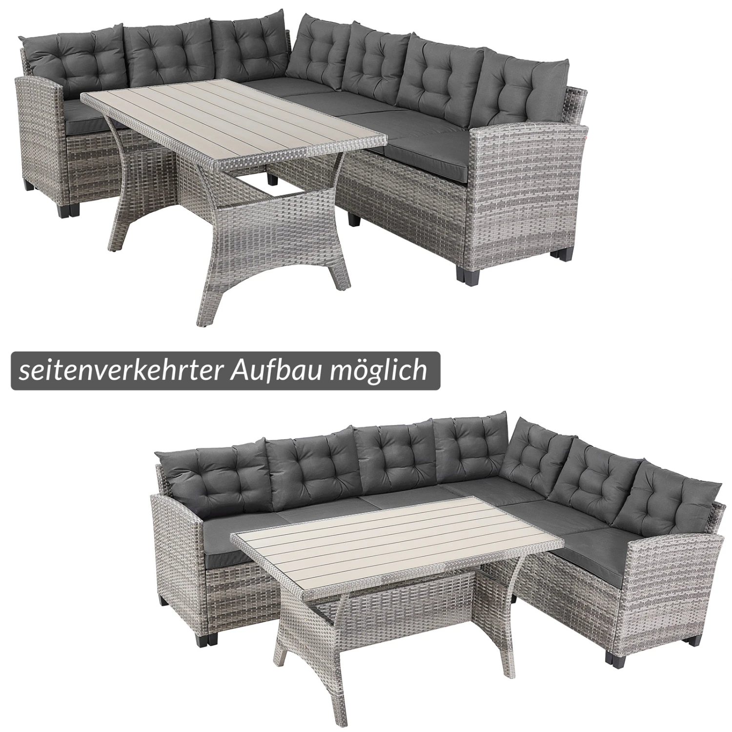 Die Sitzbänke sitzen auf einem soliden Stahlrahmen und halten auch starken Beanspruchungen stand. Damit die Loungegarnitur auf unebenen Böden einen sicheren Stand hat, sind bei den Tischbeinen Ausgleichsschrauben vorhanden. Die Lounge bietet bis zu 6 Personen Platz!