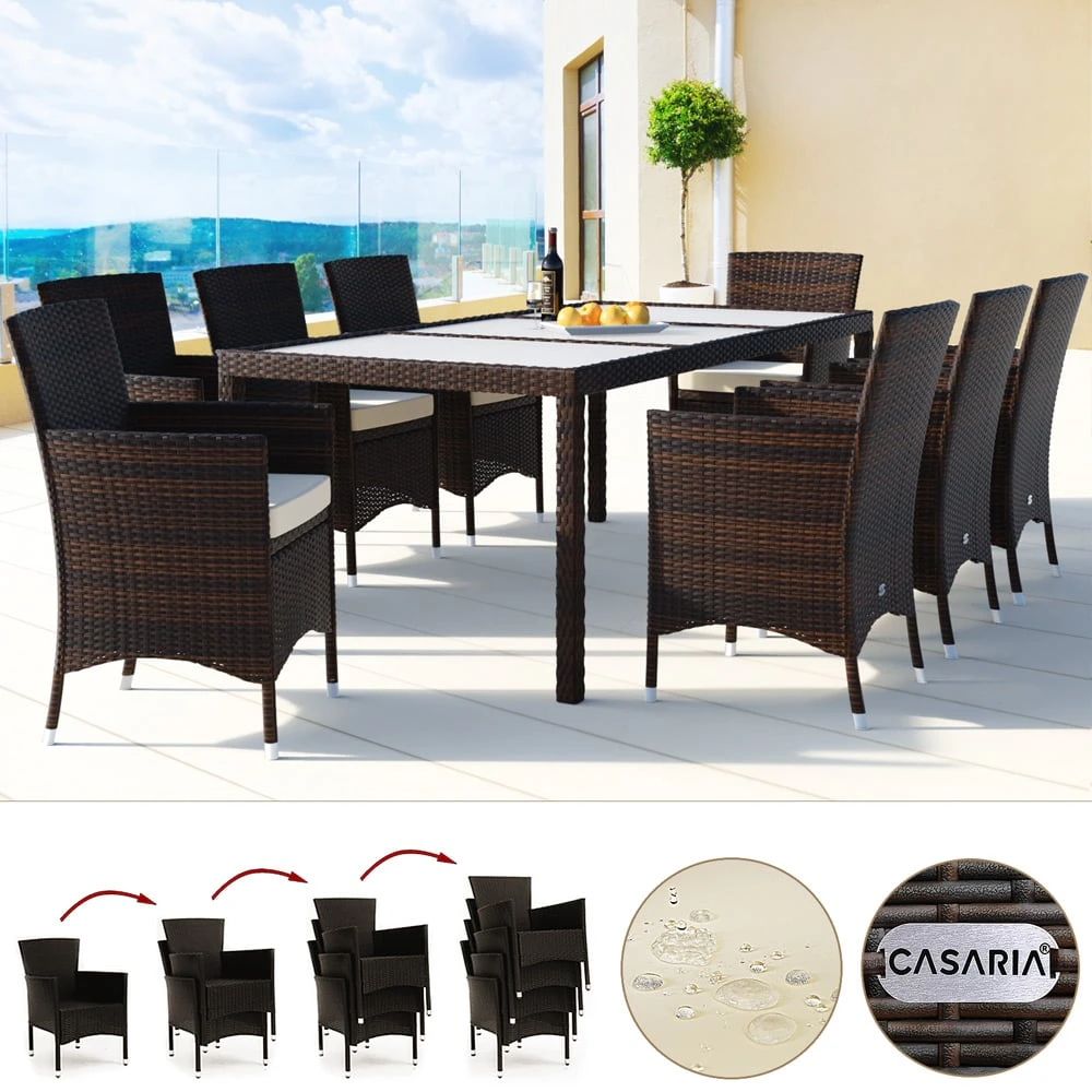 Das Gartenmöbel_Set besteht aus einem Gartentisch und 8 stapelbaren Stühlen mit 7 cm dicken, abnehmbaren Sitzauflagen für besten Sitzkomfort.
