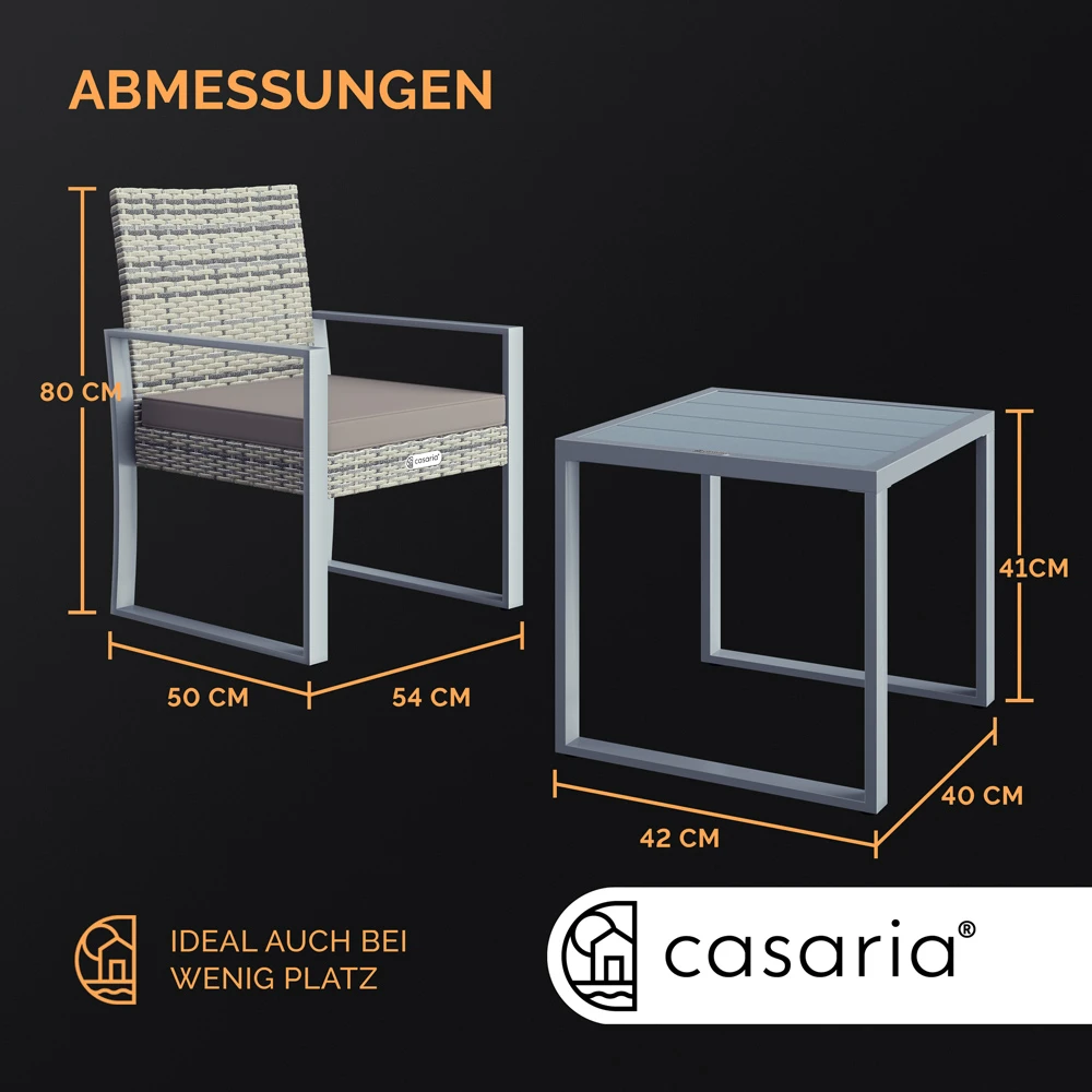 Mit diesem 3-teiligen Set von Casaria® hast du alles, was du für gemütliche Sommerstunden im Garten oder auf dem Balkon brauchst: zwei weich gepolsterte Stühle für dich und Besuch und einen kompakten Tisch für Limo, Knabbereien oder einen Cocktail bei Sonnenuntergang.