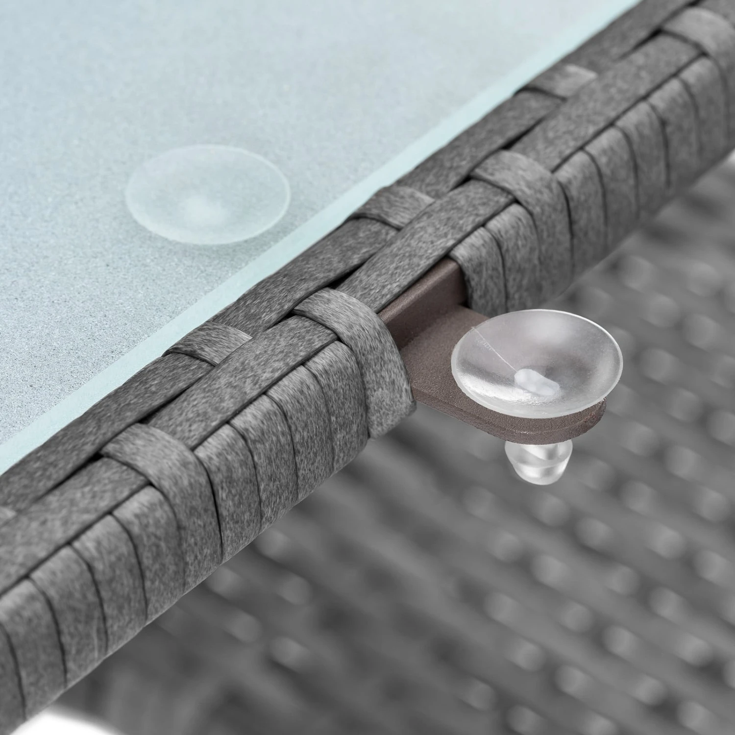 Das pulverbeschichtete Stahlgestell des Tisches und die zusätzlich angebrachten Querstreben hält auch starken Beanspruchungen stand. Das hochwertige Rattan ist wetterfest, UV-lichtbeständig und einfach zu reinigen.